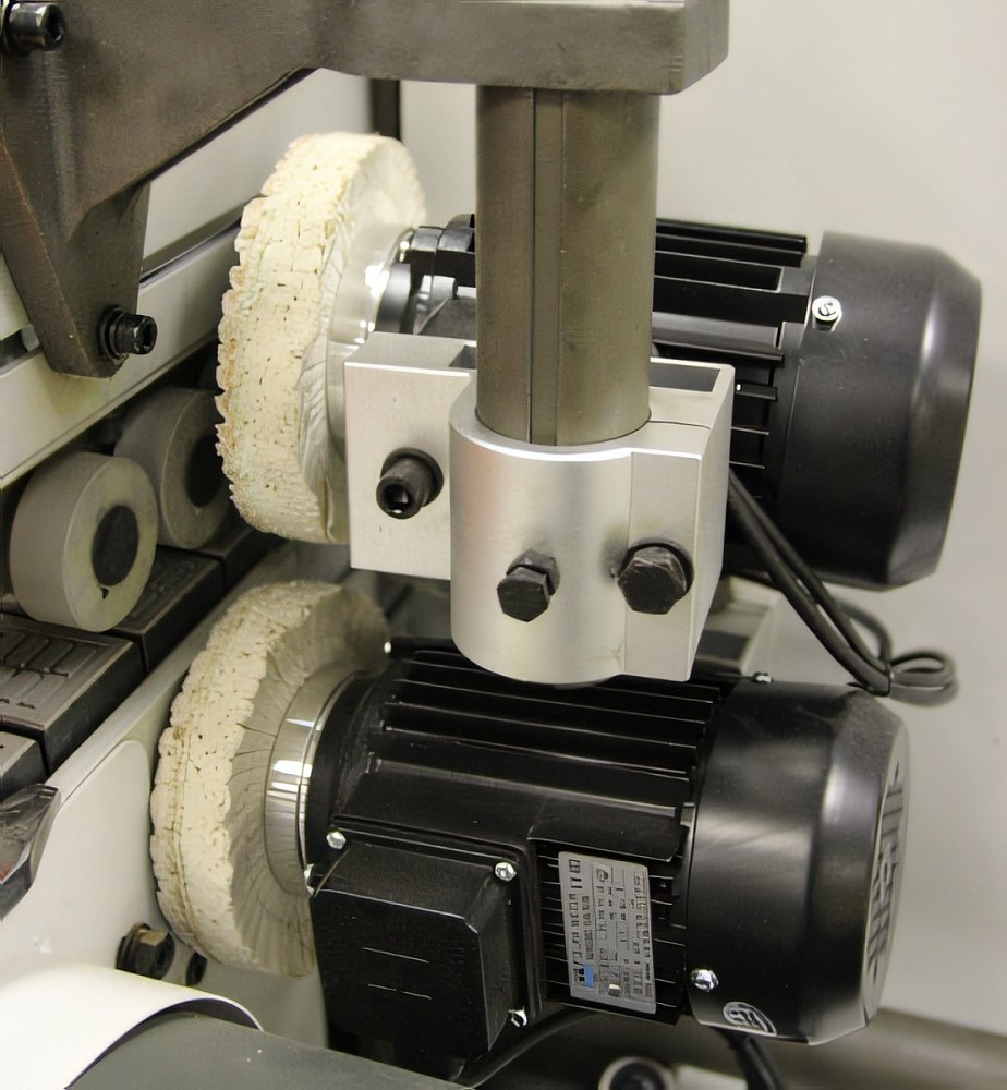Узел полировки с кругами из двухслойной ткани необходим для финишной обработки кромки. Придает блеск обработанной поверхности, очищает от загрязнений.