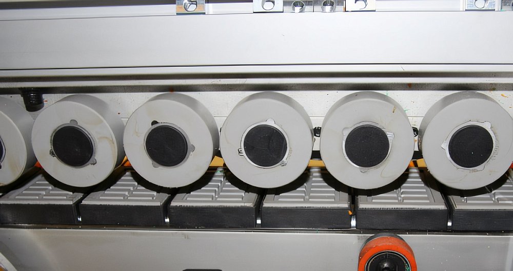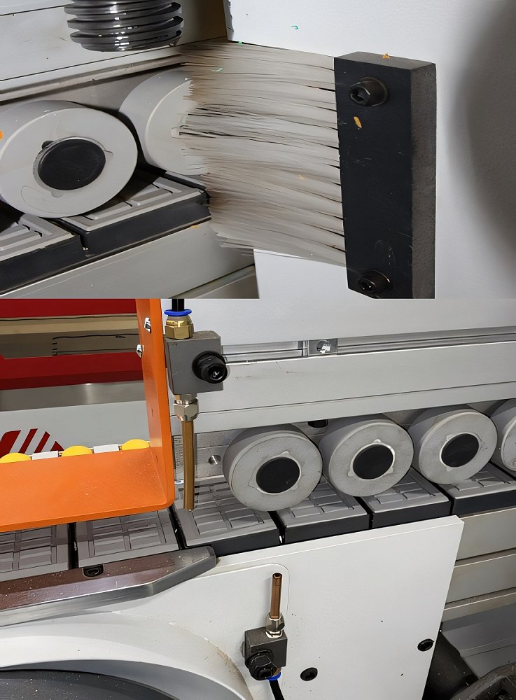 В перегородках станка в зоне прохождения детали установлены щетки для очистки обработанной детали от пыли и частиц кромочного материала предыдущих узлов, который может попасть под копиры последующих узлов.